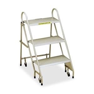 Product Description : Cramer Industries, Inc. 3-Step Folding Platform Ladder,19-1/2"x27-1/2"x33-3/8",BeigeThree-step steel ladder folds to 10-1/2" wide for easy transportation and storage and holds up to 300 lb. Ideal for warehouse, garage, plant and workroom. When a person's weight is applied, the 2" hard-floor casters retract, and the ladder frame lowers to the floor. Ladder has anti-skid rubber feet. Perforated steel steps prevent slipping. Top step height is 27". Ladder is made of 16-gauge steel.